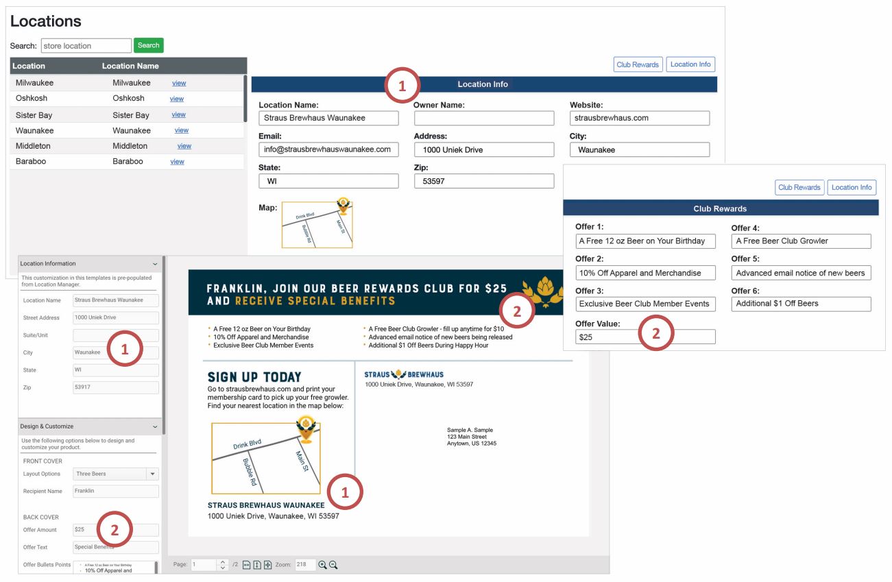 In the example below the locations address information (1) and offer value (2) is imported into the template fields and then applied onto the postcard.