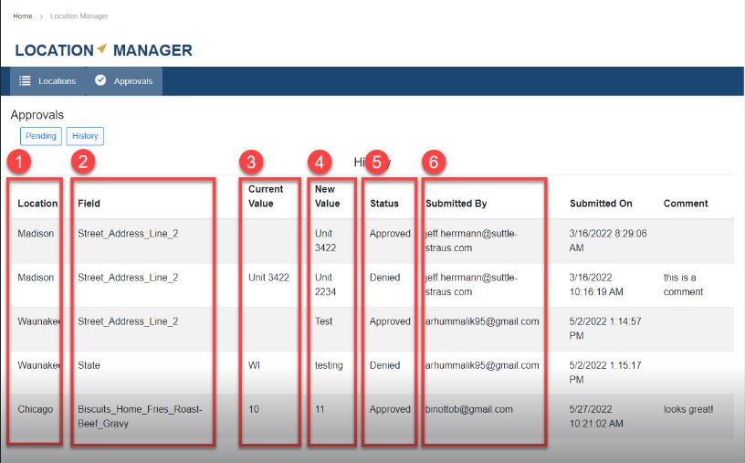 The HISTORY button takes you to a list of all previous changes made in Location Manager, including details such as old value, new value, status, person who made the request, and any comments noted by the reviewer. This way, if there are questions later, the previous information can be referenced.