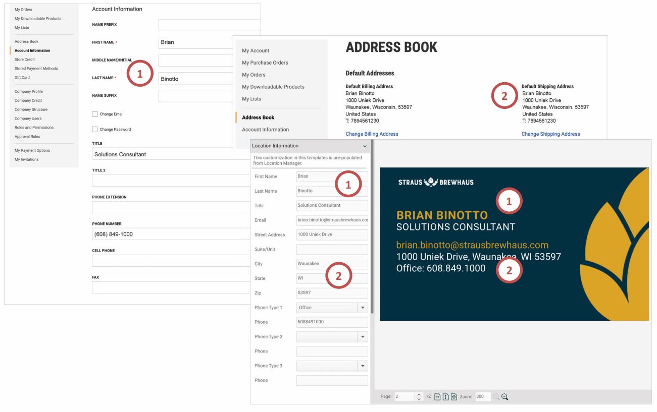 In the example shown here the business card is using information from the users Account Information (1) and saved default Shipping Address (2) to automatically populate the content of the card in Media Builder.