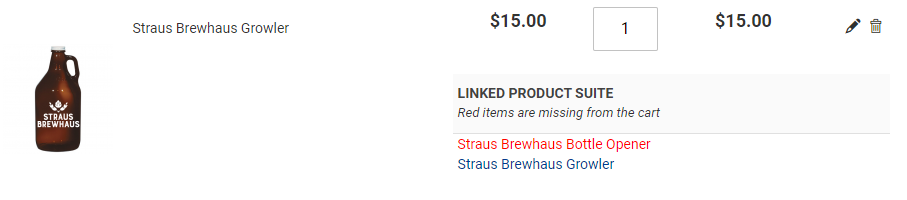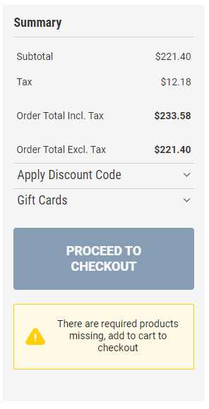 Once you put an item in your cart that is part of a Linked Product Suite, you will be unable to complete checkout until each linked products also is in your cart. The checkout button will be grayed out, and a warning explains the action necessary: