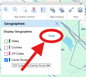 - 4. Geographies – shows outlines and labels for states, counties, zip codes and carrier routes. Once they're on, you can click inside an area of the map to pop up a display for demographic counts in that area - but you CAN NOT filter by this info in the overlay. It's merely informational to aid in making route decisions.