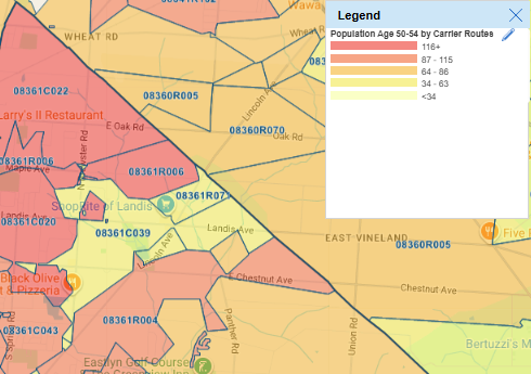 - 5. Demographics – displays a heat map of desired characteristics for a chosen demographic by carrier route or zip code. You CAN NOT filter by this info in the overlay. It's merely informational to aid in making route decisions.